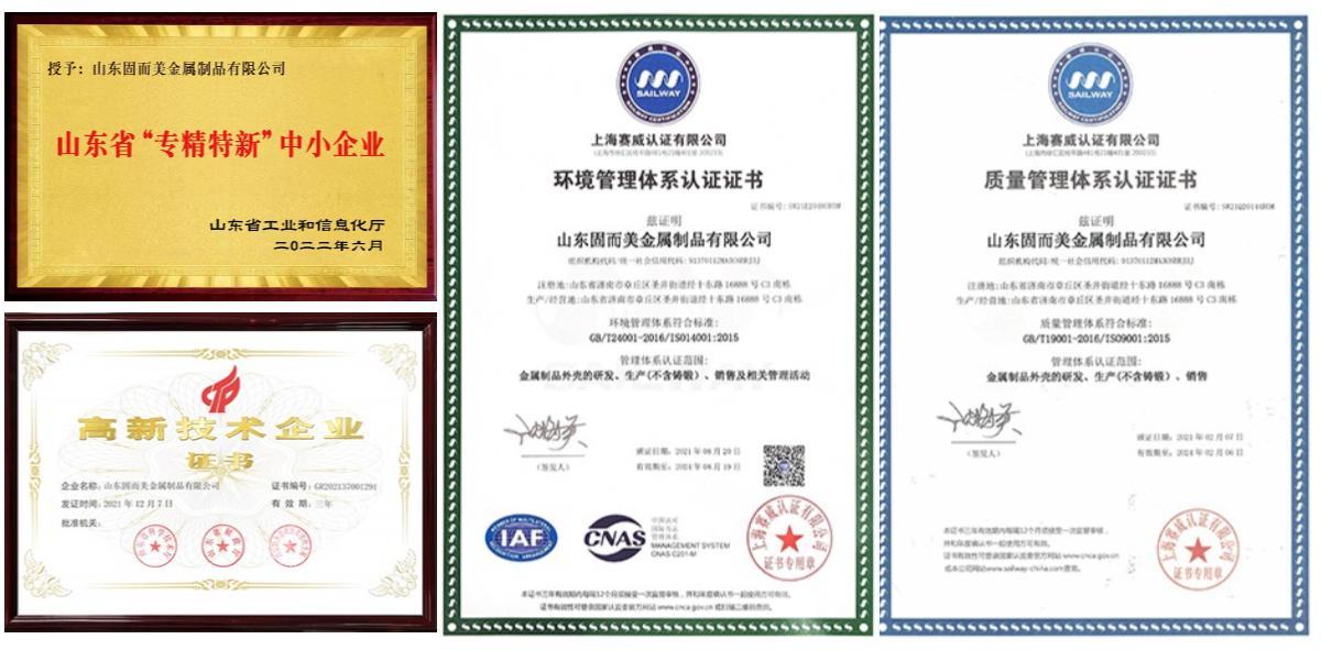 山東固而美金屬制品有限公司一直致力于為客戶提供更好的外殼解決方案,公司有專業的設計團隊,獲得國家專利共39項,實用新型專利35項,外觀專利3項,發明專利1項,產品均通過ISO9001質量體系認證和ISO14001環境管理體系認證,有成熟完善的生產線,作為專業的鈑金加工廠,企業有三萬件產品的研發經驗。廠家有專業技術工人,含過程檢和完檢兩道質檢工序,全天候工程人員在線為您提供技術支持,選擇我們更放心!歡迎各位廠家、客戶來圖或來樣定制產品
